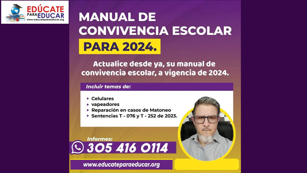 PARA RECTORES 08 Oct Actualice su Manual de Convivencia Escolar para el 2024 EDUCATE PARA EDUCAR 1 Comment https://www.educateparaeducar.org/wp-content/uploads/2023/10/Educate-para-educar-actualice-su-Manual-de-Convivencia-Escolar-para-el-ano-2024-Ley-1620-antes-y-dia-de-la-matricula-Ley-115.mp4 Share Link:
